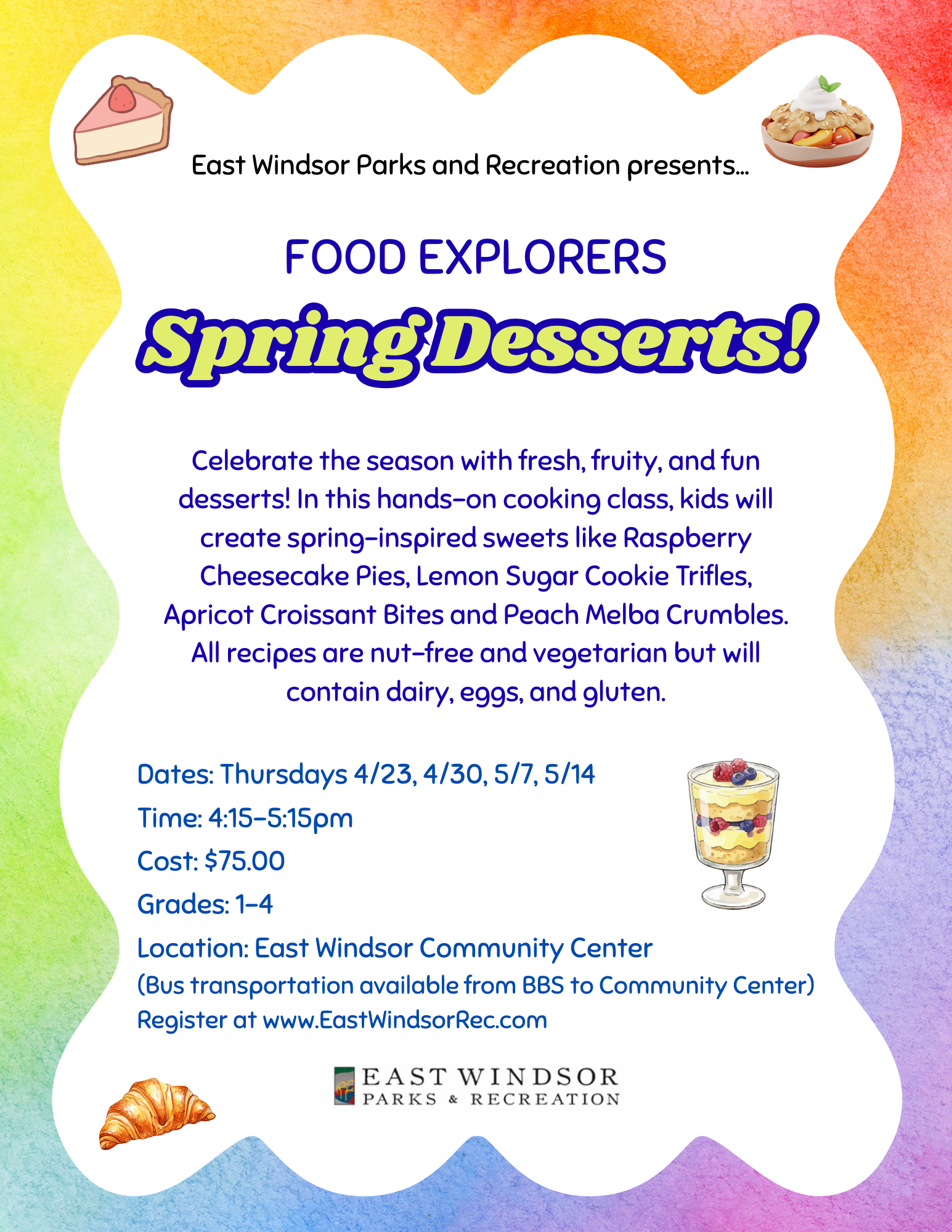 Spring Desserts (4 weeks): Celebrate the season with fresh, fruity, and fun desserts! In this hands-on cooking class, kids will create spring-inspired sweets like Raspberry Cheesecake Pies, Lemon Sugar Cookie Trifles, Apricot Croissant Bites and Peach Melba Crumbles. All recipes are nut-free and vegetarian but will contain dairy, eggs, and gluten.