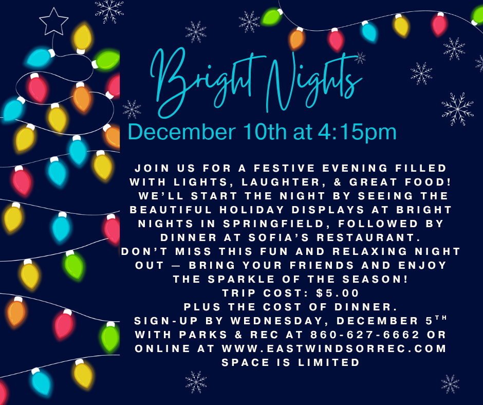 Join us for a festive evening filled with lights, laughter, and great food! We'll start the night by seeing the beautiful holiday displays at Bright Nights in Springfield, followed by dinner at Sofia's Restaurant. Don't miss this fun and relaxing night out - bring your friends and enjoy the sparkle of the season!