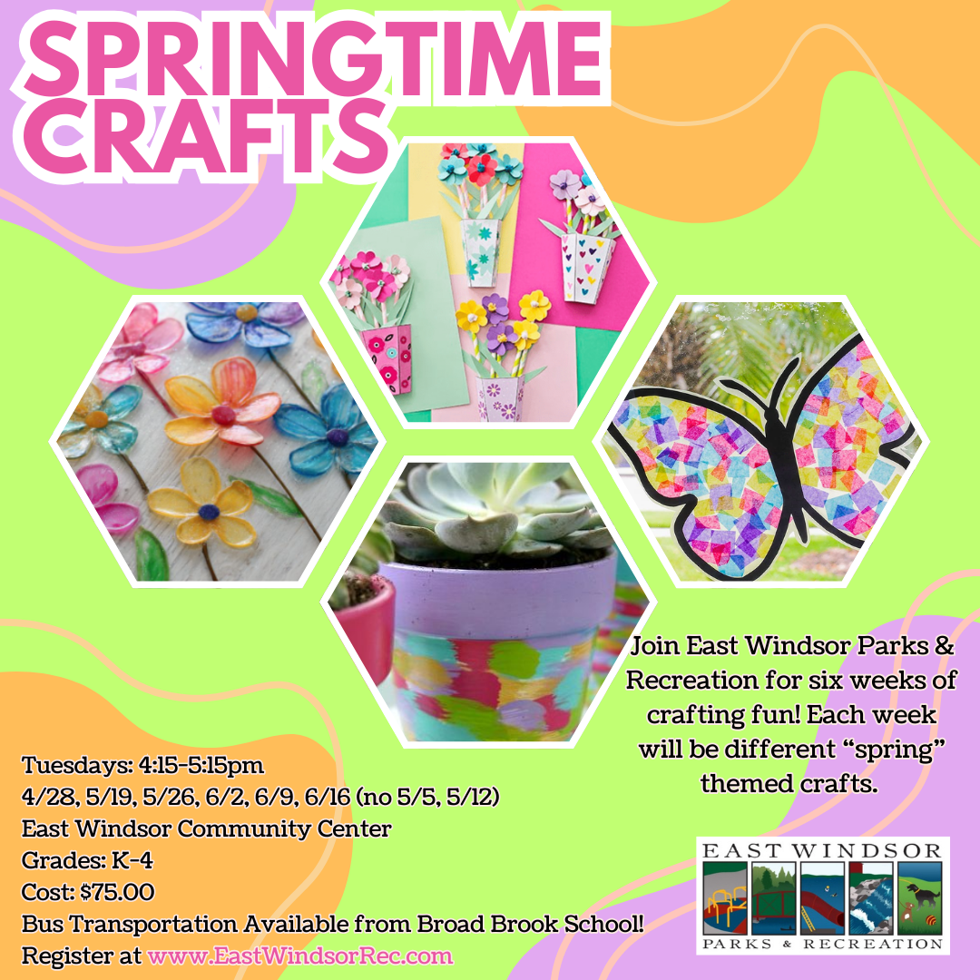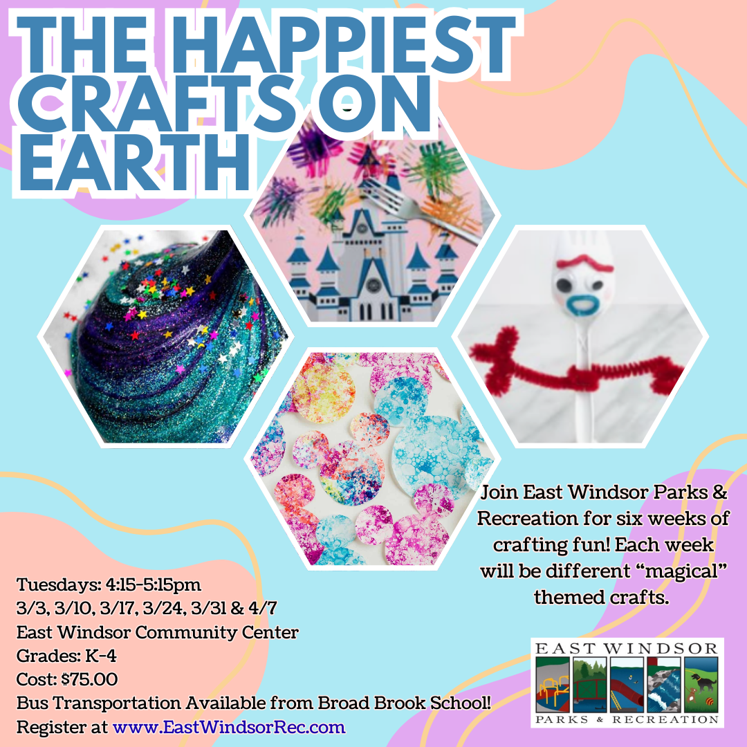 Join East Windsor Parks & Recreation Staff for a weekly craft club! Each 6-week session will have a different theme. All supplies included in the cost. Bus transportation available from Broad Brook School to the East Windsor Community Center, but parents/guardians must pick up child from Community Center at end of program.
