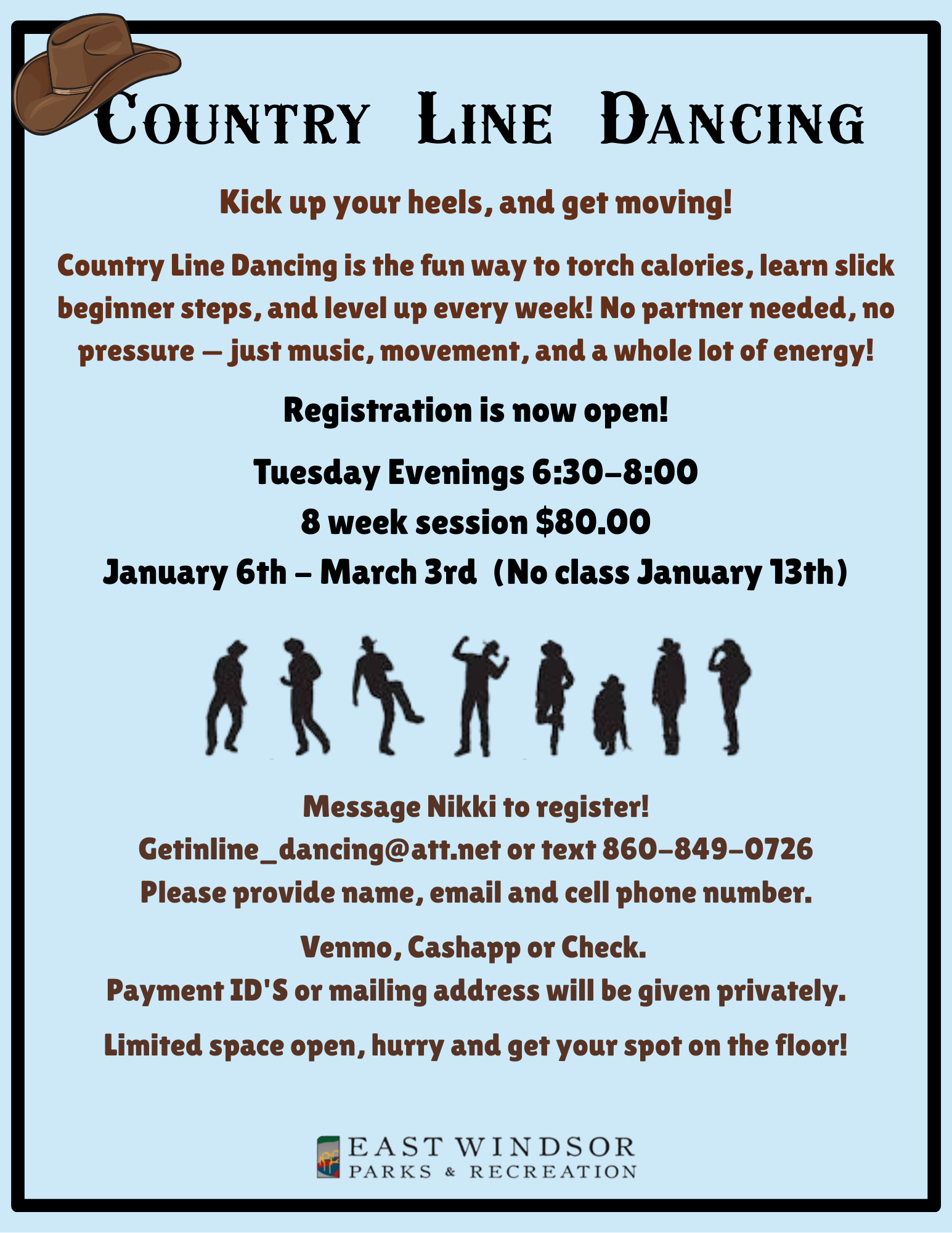 Beginner level class, which teaches the basic steps that are associated with line dancing. Line dancing is a constructed pattern of steps that repeat and create the dance. Various dances are taught throughout the 8-week session. Please allow a few extra weeks on your calendars for possible reschedule dates due to winter weather. Emails are sent home with "practice links" of each dance taught at class. Practice makes perfect, so use these links at home during the week before the next weeks class. This is a great form of exercise for both the body and mind! $80 for the 8-week session, 6:30 - 8:00pm. pre-registered. Registration closes before class begins its first night. Maximum of 30 dancers. Accepted forms of Payment are Check or Venmo. Mailing address or Venmo ID are provided upon our conversation. Name, cell number and email address are needed to complete the registration.