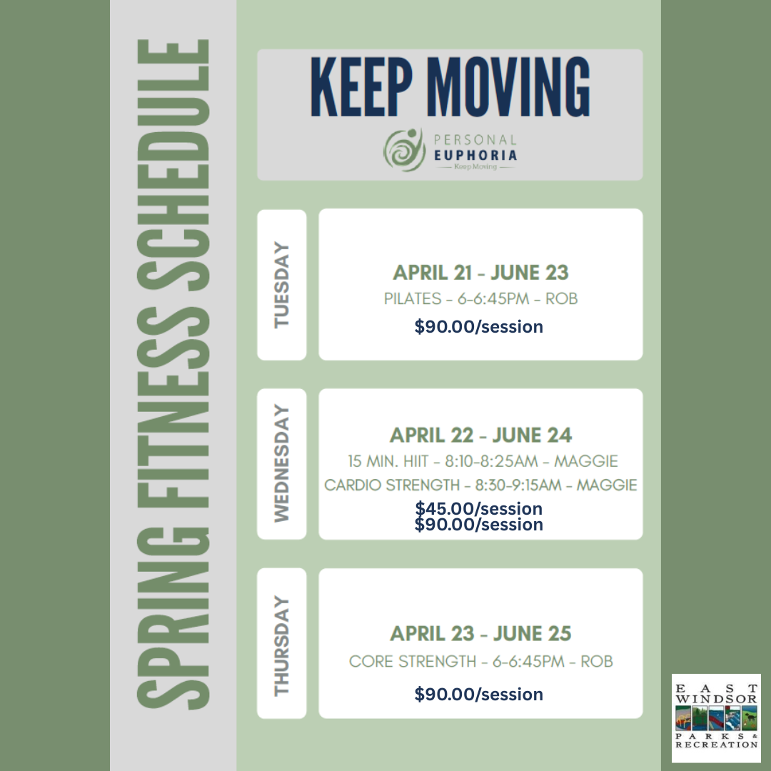 East Windsor Parks & Recreation is partnering with Personal Euphoria to offer virtual fitness classes during the Spring Season!